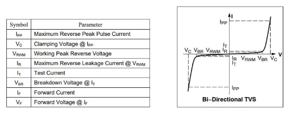 如图的电压-电流曲线图,是不是有点熟悉,是的,类似于稳压二极管的曲线图,对于TVS二极管我们很多时候是关注它能工作的钳位电压,当电流达到一定值,也就是能达到使TVS二极管最小击穿电压VBR时,到达最大箝位电压VC时候处于峰值,也就是TVS两端出现的最大电压值。